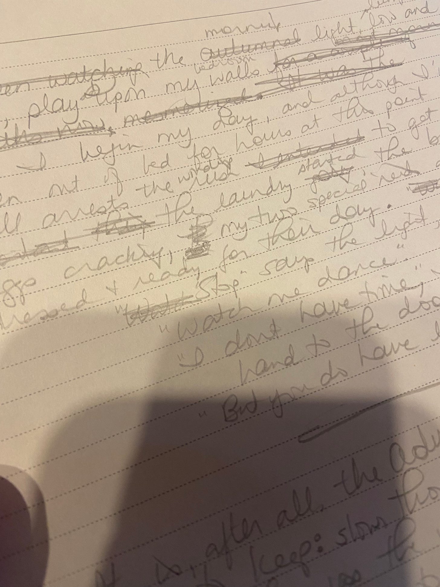 I started out, as I always do, with digging out from my desk a new (ish, you see, what with old papers ripped from the spiral and its spine bits picked out) notebook. I sharpened my yellow pencil. I set them by my chair, took a short video of the light play upon the walls, and walked through the door to my work.